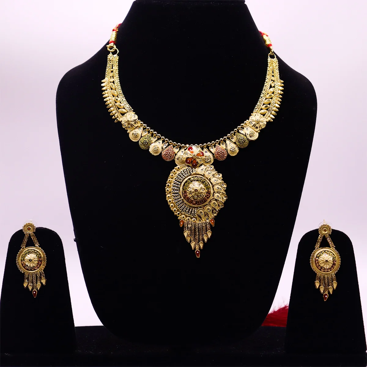1.5 gram gold forming Gold Plated traditional necklace Set made by copper and brass material and having Indian traditional design work, the box will contain one necklace and earrings set at attractive price only at Jewelly.in. NOTE: The image color on the website may be different from the real product because of the camera settings but we have tried or best to provide a near to actual colour.
